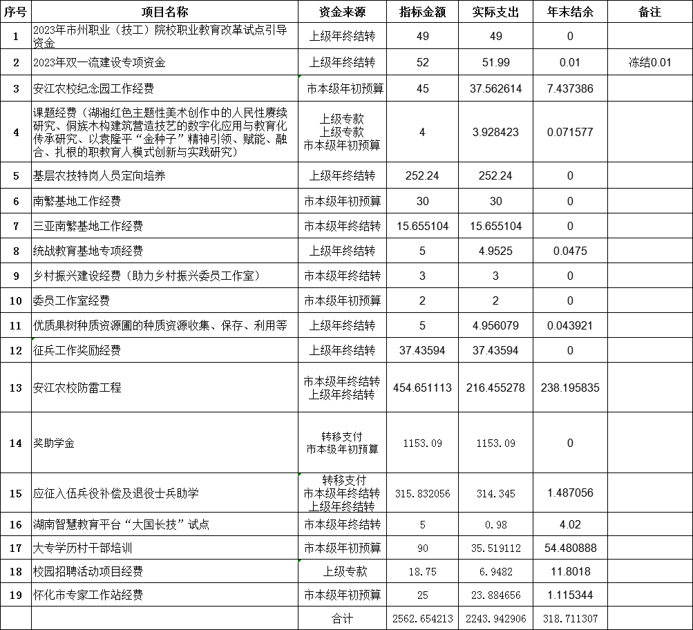 怀化职业技术学院2024年项目资金的使用按照各专项资金管理办法及相关财政规章制度执行,严格按照开支范围和标准开支,确保了资金使用规范、高效。2024年主要财政资金项目支出情况见下: